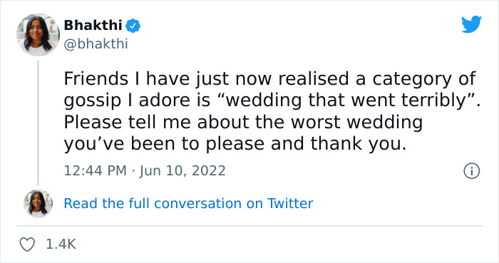 And this Twitter thread that has gone viral holds proof. Last week, a journalist based in Australia who goes by the handle @bhakthi invited people to spill the tea about weddings that went terribly wrong. Right after confessing this is a category of gossip she adores, she added, "Please tell me about the worst wedding you’ve been to please and thank you."