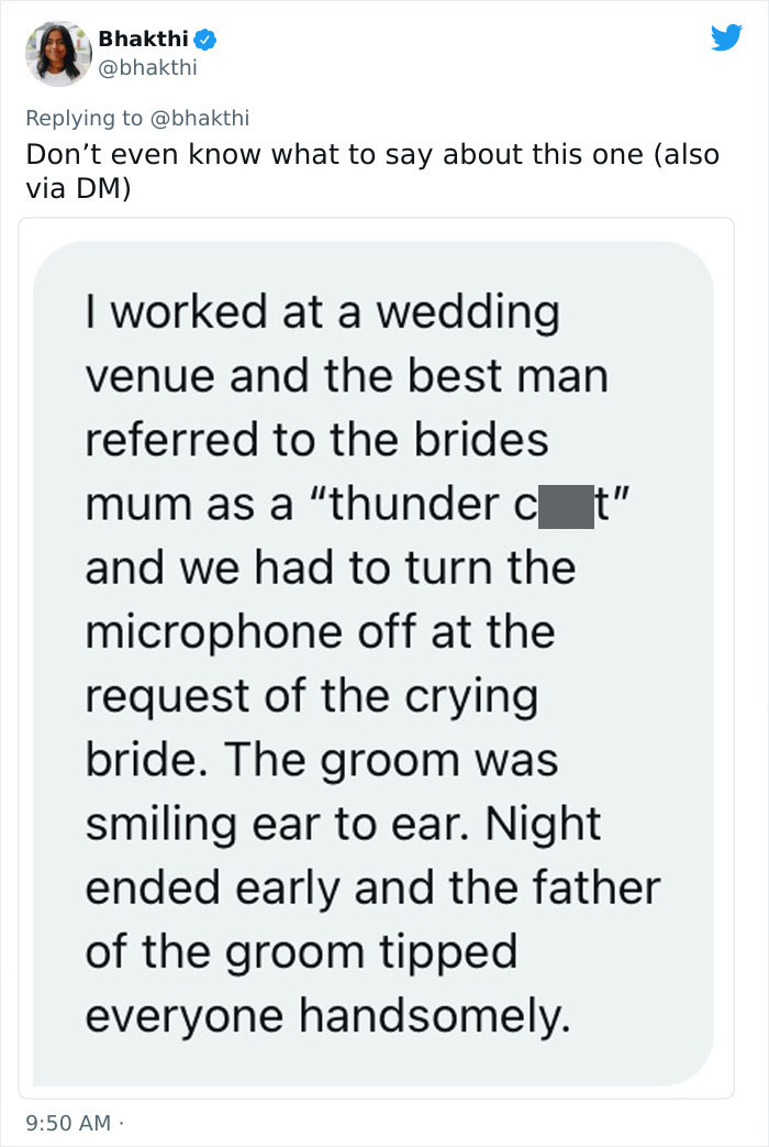 Well, that’s the lesson we can take from Bhakthi’s viral Twitter thread that has attracted people from far and wide to share their unfortunate wedding experiences. It’s hard to believe that some people manage to make their big day into an occasion that everyone will gossip about for years to come. While some of the stories left us mentally wincing and overflowing with extreme secondhand embarrassment, it’s important to remember that all kinds of things can go wrong when two hearts become one. And no one is immune to mishaps and awkward moments.
