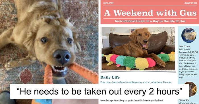“Gus does best when he adheres to a strict schedule,” the leaflet starts. “He can become rambunctious if he gets to decide how the day goes!” The sister then goes on to explain that Gus needs to be taken outside every two hours. But “potty time does not mean outside playtime. He will try and trick you… stay on your toes.” Gus’ owner warns her dogsitter.