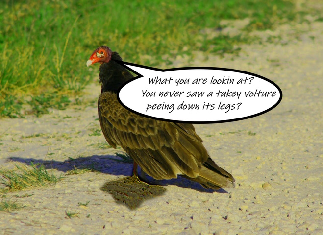The turkey vulture pees down its legs and does so on purpose. The process, not to be confused with urinary incontinence, is named urohydrosis. It helps cool down the vultures during hot weather. As the fluids in the waste evaporate, the blood vessels in the foot cool and bring down the bird's body temperature. The bacteria on their legs are also believed to be eliminated by the urine's high acidity.