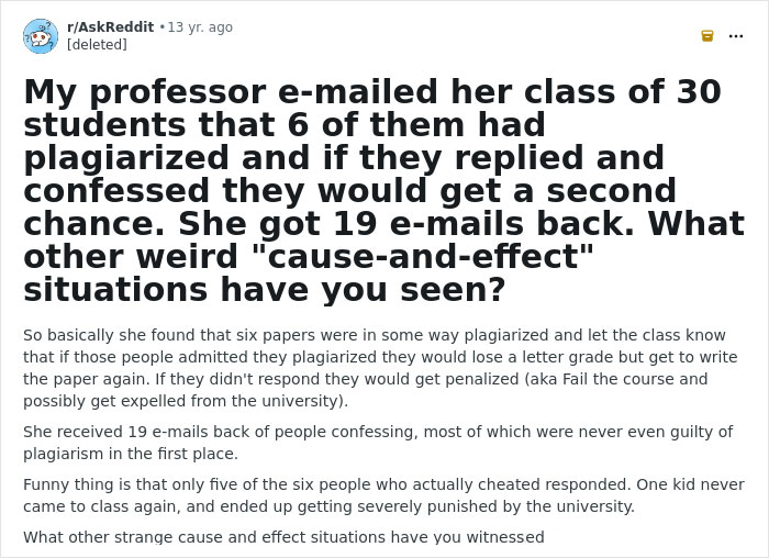 Something similar to this happened my freshman year of college. After a writing assignment in an English class the professor came in and turned his back to all the students. He stated that someone in the class has blatantly plagiarized on their paper and he demanded that after class that person come meet with him in his office to discuss the matter. If the person showed up then he would be lenient with their punishment. I noticed everyone's eyes get wide and dart to each other. I knew I didn't plagiarize so after class I gathered my things and headed out of the building. On my way past the professors office I noticed a line of 20 students waiting to see him.