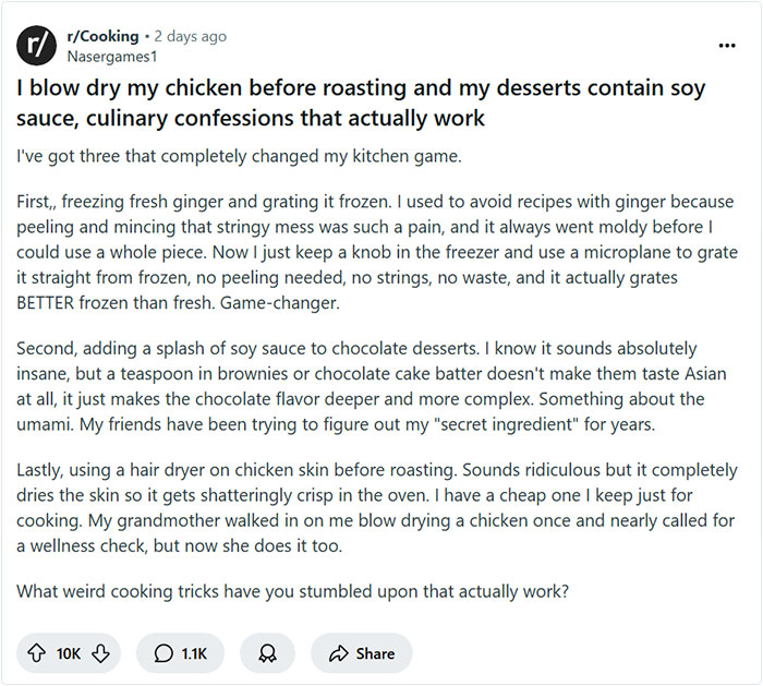 A recent post on r/Cooking by Reddit user Nasergames1 asked people to share their most unusual but effective kitchen hacks, and the replies have been pouring in about everything from product selection to their preparation methods, and beyond.