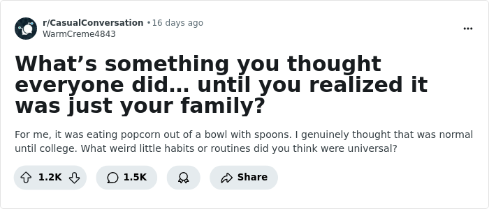 Redditors have been recalling unique habits and traditions that their families instilled in them that they eventually realized weren’t exactly normal, so we’ve gathered their most interesting replies below. Enjoy reading all about these families, and be sure to upvote the behaviors that you find particularly strange!