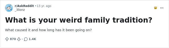 Netizens have been revealing the most bizarre, wholesome, and unexpected traditions that their families have. From how they celebrate certain holidays to rules that they must follow before leaving the house, this list proves that every family is special. Enjoy scrolling through these traditions that you might want to implement in your own family, and be sure to upvote your favorites!