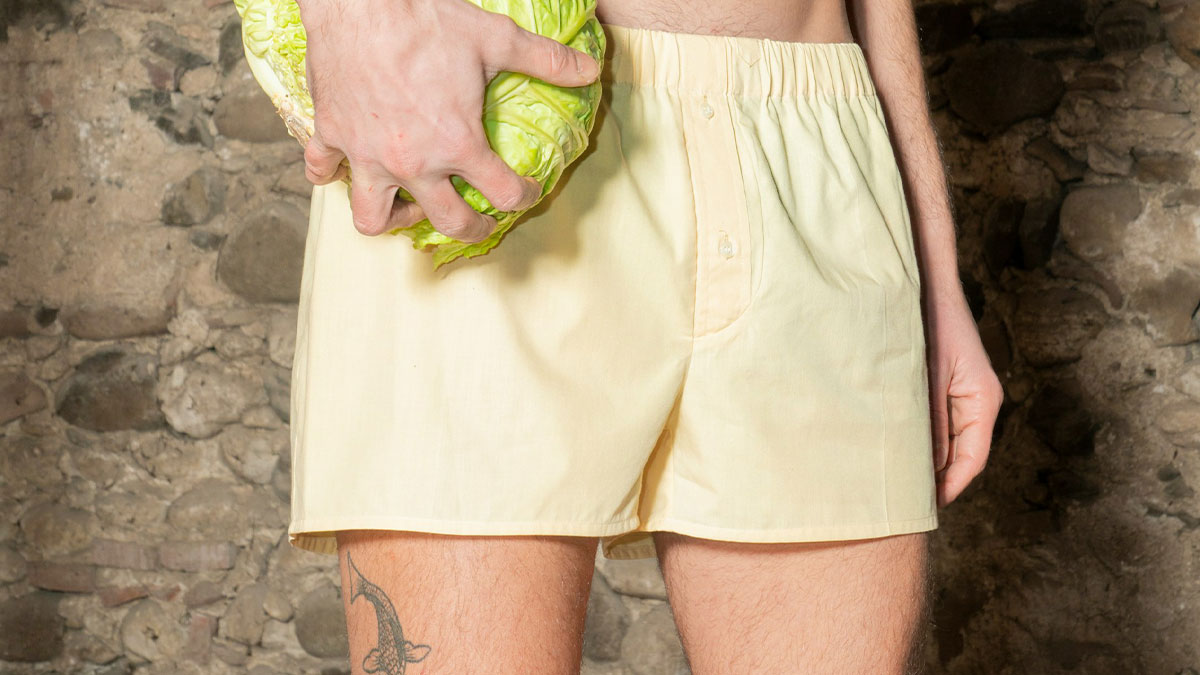Shirtless man wearing yellow shorts holding a head of cabbage in a rustic setting, representing weird family traditions. As long as I can remember, almost all of the guys in my family take off their pants when they get home. None of us like wearing pants, we just peruse the house in boxers all day.