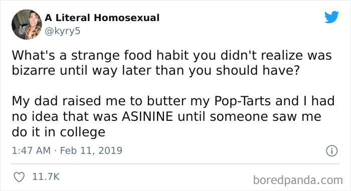Bored Panda reached out to the thread’s author Kyle who goes by the Twitter handle @kyry5. Kyle said he got the idea for a tweet while he was talking to friends about how insane his diet was when I was younger. “I used to be on the chunkier side and was talking about how much junk I would eat (hot pockets for breakfast, lunch, and dinner, toaster strudels for dessert) and how even the junk food was made junkier (enter, the buttered pop tarts!)”