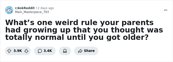 Recently, some members of AskReddit spilled the tea about the weirdest rules that their parents had at home. It was only after they grew up that they realized just how odd they really were. We’ve collected some of their most intriguing and peculiar childhood stories, and you can check them out as you scroll down.