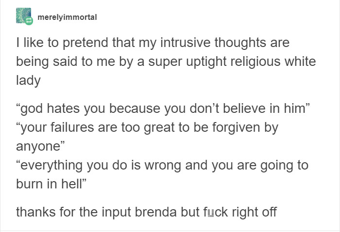 Dissassociating from intrusive thoughts and experiencing them instead as coming from an annoying or laughable stranger seems to work for many people, the ability to ridicule and laugh the interlopers off gives an element of power and control back to the suffererer. After bulbubsaur shared her method, many others jumped on the thread to tell their own stories and ways of coping with their demons, and it is truly enlightening while darkly funny at the same time.