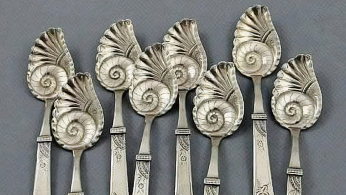 "Duhme antique sterling ice cream spoons. A set of sterling silver ice cream spoons by Duhme of Concinnati with hand engraved satin finished handles and chased and engraved bowls." Escargot utensils generally come in two parts - a small "clamp" for holding the shell and a pick for picking out the poor creature that once enlivened the shell.