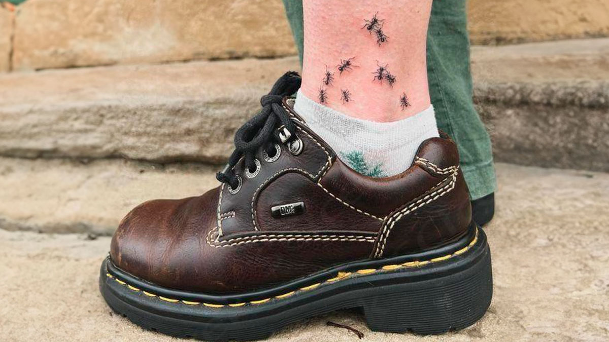 Tattoo of realistic ants on leg near shoe, creating optical illusion.