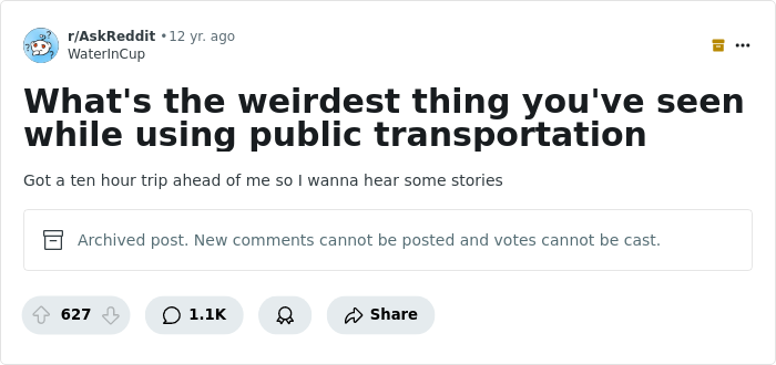 To find out how this conversation started in the first place, we reached out to Reddit user WaterInCup, who invited others to share their wildest public transportation stories. They were kind enough to have a chat with Bored Panda and share that they began this thread while sitting in study hall bored.