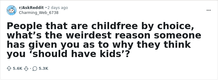 Im not child free. I have 3 but from observation I think the weirdest one is “whos gonna take care of you when your old.”
