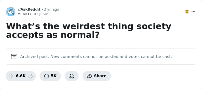 The folks on this list share all the examples of things that have been accepted as normal that are actually pretty weird and bizarre. Some of them you might agree with, and others you might have opinions on. Maybe you might even come up with examples of your own!