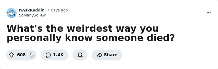 A person recently asked, "What's the weirdest way you personally know someone died?" and the stories came flying in faster than the Grim Reaper himself. Some are tragic, others ironic, and a few are almost too bizarre to believe. They're all reminders that while life is strange, death can be stranger yet.