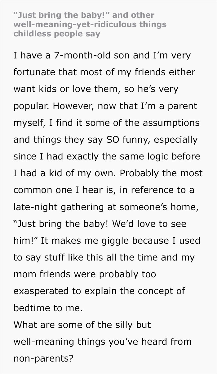 Scroll down for the best ‘just bring the baby’ moments, upvote your favorite ones, and tell us all about your experience with your non-parent friends in the comments.