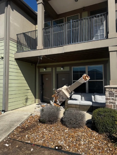 OP says: "My neighbor drove his car into the building. Now my front door won’t shut and they have to rebuild the whole wall." I have included the second pic from the OP that makes more sense - see below.