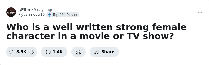 So, recently, a thread appeared in the AskReddit community, the author of which, user u/Piyushmessi10, asked the question: "Who is a well-written strong female character in a movie or TV show?", and in more than a week, it has collected over 3.5K upvotes and nearly 1.5K various comments.