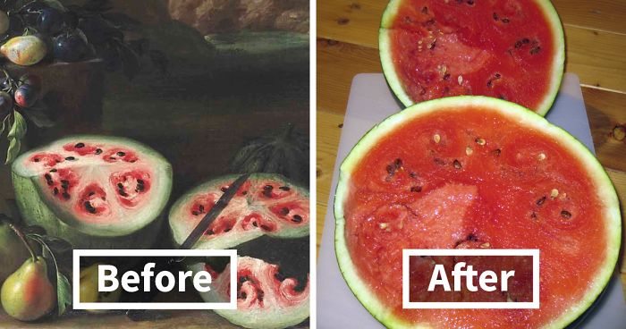A crop of a 17th-century painting by Giovanni Stanchi shows watermelons in a completely different form than we’re familiar with. The artwork which was painted between 1645 and 1672, depicts watermelons haing swirly shapes embedded in six triangular pie-shaped pieces, as well as large seeds and the inside that is dominated by the white flesh that most of us consider inedible nowadays.