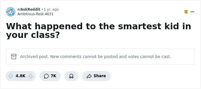 My class had a lot of smart kids, so I don't know what happened to the smartest, or even exactly which kid that was. I don't know exactly what happened to most of them other than they went to study sciences and maths, but one of them went on to only study a creative subject, nothing academic, and is happier than she ever was studying academic subjects, despite how good she was at them and how she was often encouraged to study sciences or maths because of her grades.