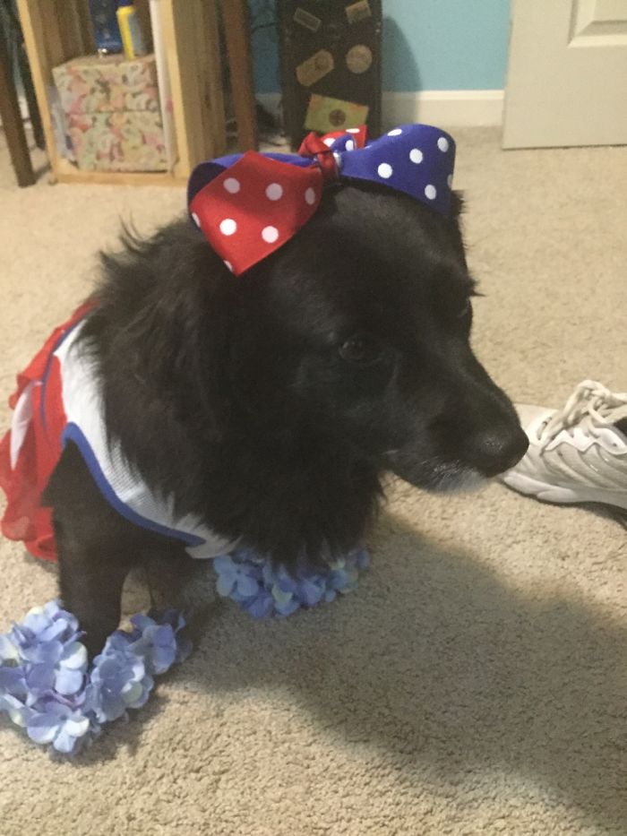 I decided to dress up my dog to win a competition for dogs. It’s not a dog show but it’s like a dog get together thing. So I dresses her up like a cheer leader! The thing is tomorrow but I thought I would make sure everything was still ok. When I got everything off a big boom happen. Someone I guess was practicing gun shooting or something. She ran off and by the time I found her… she was like this on the couch!