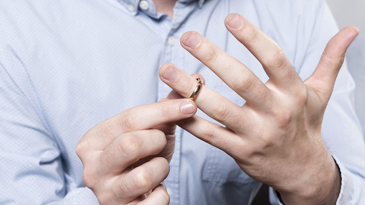 Man in blue shirt removing a ring, symbolizing a decision on what type to never date again. Married. Had no idea until his wife reached out to me after the fact….