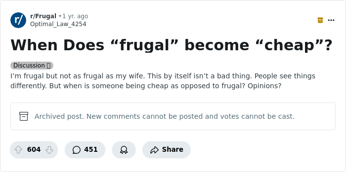 That’s why it’s no surprise that a Reddit thread from a year ago discussing these differences received a flood of responses. A user simply asked, “When does ‘frugal’ become ‘cheap’?”