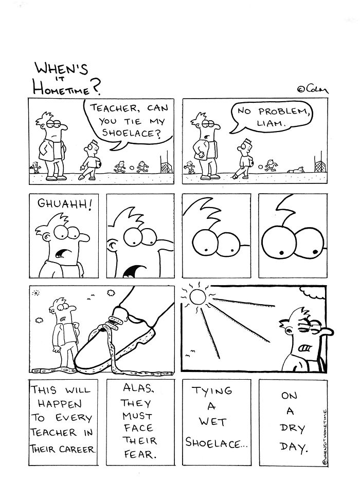 Hi there. I am a Primary School Teacher from Ireland who draws a comic strip about the life of a teacher. It is called 'When's it Hometime?' and I post regularly to my Facebook, Instagram and Twitter pages. Last year I decided to merge my two passions in life-teaching and cartooning...and these are the results. I try to capture the humour, innocence and conversations of everyday life in the classroom. I'm sure fellow teachers, parents and anyone who used to be a kid will relate to these!