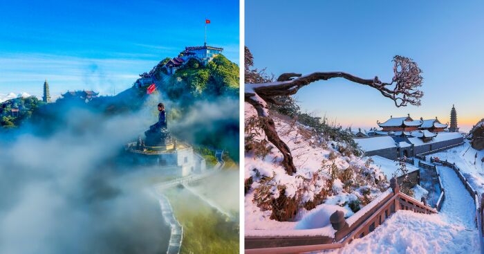In addition to admiring the glistening frost atop Fansipan, visitors can also experience a spiritual retreat amidst the grandeur of nature. Beneath the majestic Great Buddha Statue of Amitabha, clouds drift lazily, embracing ancient Vietnamese temple structures. This creates a serene and mystical atmosphere as if stepping into a living watercolour painting that harmonizes with the surrounding nature.