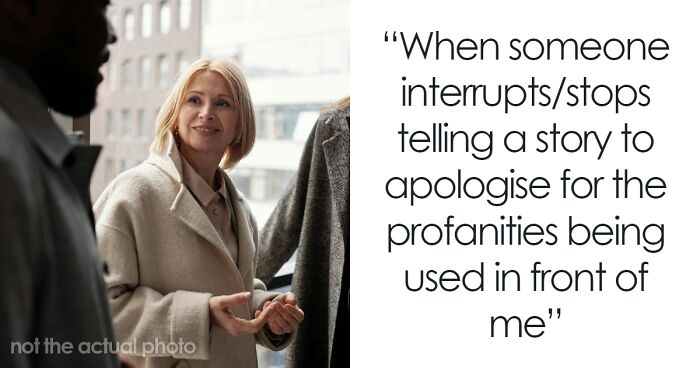 When someone interrupts/stops telling a story to apologise for the profanities being used in front of me.