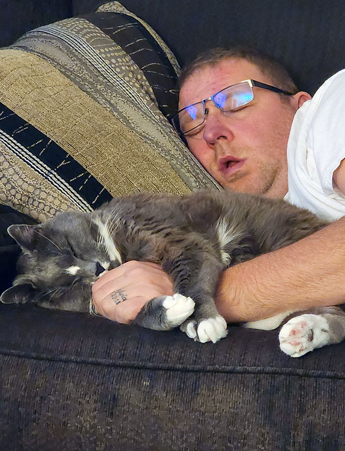 I tore a tendon years ago, and had surgery that left me laid up in a cast for a month. The entire time, I had at least one cat on the bed with me 24/7. We had three cats and a dog back then. The dog would sleep through the night in his bed on the floor next to mine, and I would have a maximum of three cats with me. They’d take turns, only really leaving to eat, visit the litter box, and stretch their legs, maybe visit my husband if he wasn’t at work. But the vast majority of their time was spent keeping me company. I never got lonely that whole month, even though my husband could only take a week off after I got home from the hospital.