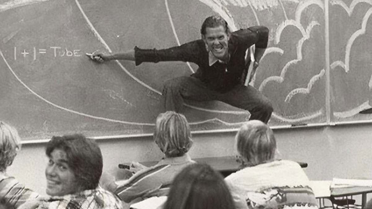 A California teacher teaching the physics of surfing, 1970.