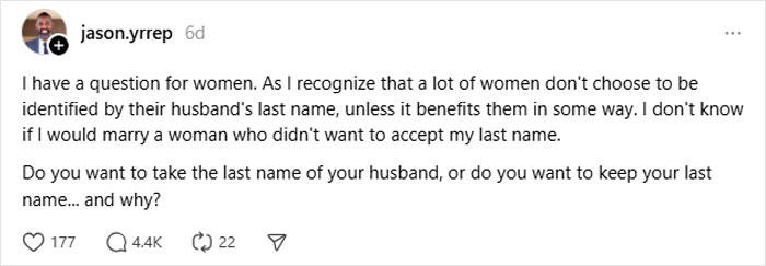 Man Asks Why Women Take Or Refuse To Take Their Husband’s Last Name And Gets 34 Responses