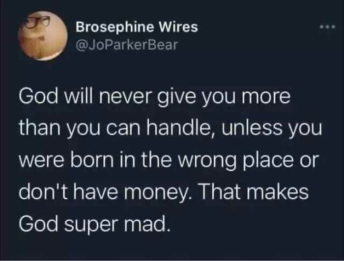 Load More Replies...god....doesn't give you anything, because god is a fictional creation of sad people desperately trying to cope with their own mortality.