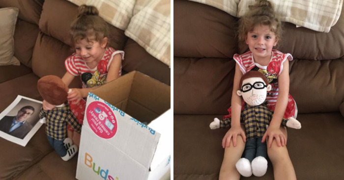 Trisha commissioned a custom plush doll of her husband. She gave the doll to her daughter, who was very young when her Daddy passed away. Now her daughter can give her Daddy a big giant hug.