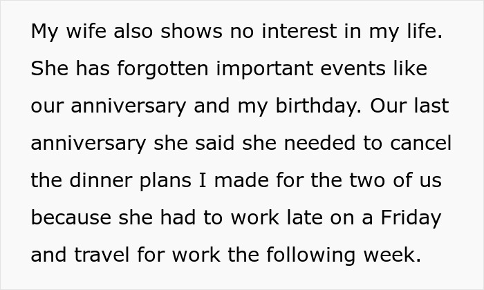 She clearly doesn't prioritise him - she choses work and socialising with friends over her husband. She also dismisses his concerns and clearly doesn't value his feelings. And my 5 year old is still talking about the holiday we took him on so that bit is also b******t. To be honest she sounds like she's checked out on her child too. I'd say counselling, etc but you have to be open for that to work - Father needs to prioritise himself and his child.