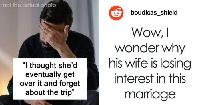 Redditor Bigappleparade and her husband had a similar dilemma when deciding on a trip for their 10th anniversary. She wanted to go where it was sunny and warm, while he considered staying at his cabin in Canada. The wife still booked it to the Caribbean, which her partner completely rejected. Nevertheless, she decided to go just not with him but with another man.
