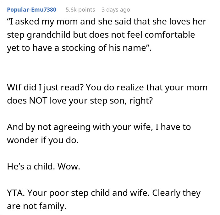 Load More Replies...It's awful that your mother refuses to get a stocking for your stepson, and even worse that you are defending her against your own wife and stepSON. Your wife has every right to be angry, and not wanting to attend a festivity where her son is seen as "less than" the other children. Children that age are easily hurt by adults playing favorites, and that is exactly what your mother is doing. Your stepson is part of your family now. Based on your actions, I guess you haven't quite accepted that yet.