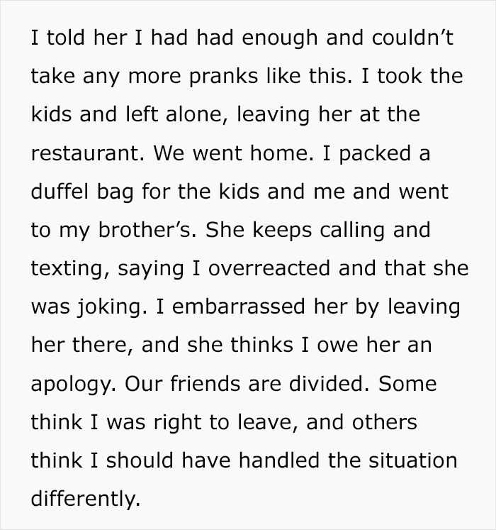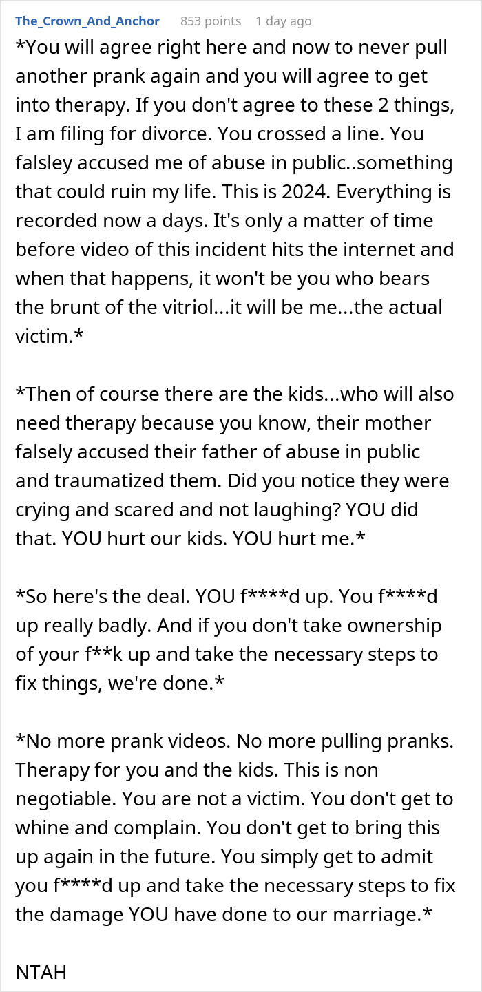 Load More Replies...Sorry, but it's better to release your wife back into the wilds. A grown woman committing a prank like that and then posing as the person who's wronged? She has no self-awareness at all. You can put firm boundaries in place and see how that goes, but judging from her reaction to your reaction I don't hold out much hope for this marriage.