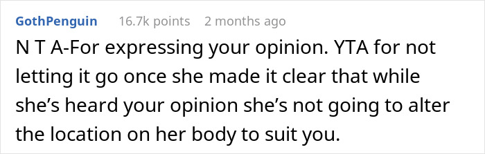 Load More Replies...All these “you’re not entitled, blah, blah, blah” are so stupid and annoying. STFU already. The dude may be a total jerk, but he’s perfectly “entitled” to say whatever nonsense he likes about his opinion. The same way she is perfectly entitled to tell him to “get stuffed.” They’re married, and if it matters to THEM then they SHOULD talk it out until it’s talked out. I mean if he announced he was getting a Prince Albert piercing and she wasn’t down with that, then I would expect the same. She literally could say “you go through with this and we’re not having anymore sex” and nobody would be surprised.