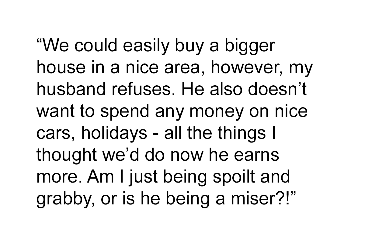 A woman described her dissatisfaction with her husband not spending his ample income on luxuries