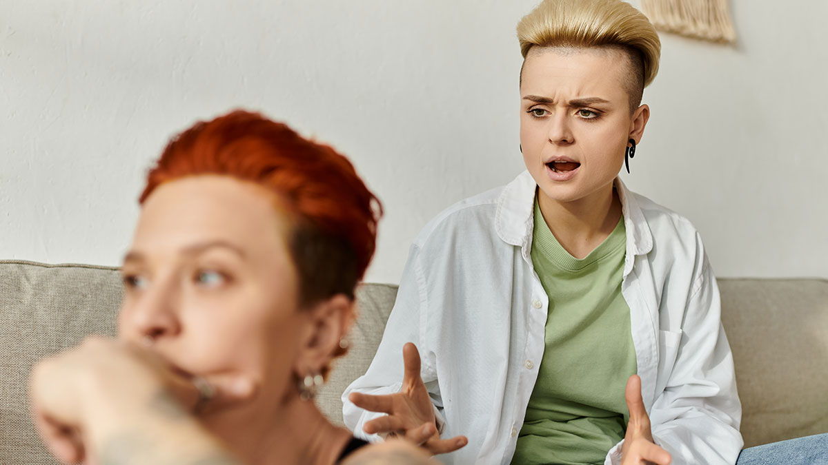 Two women in a tense conversation on a couch, reflecting the stress of taking care of wife's grandma and her will issues.