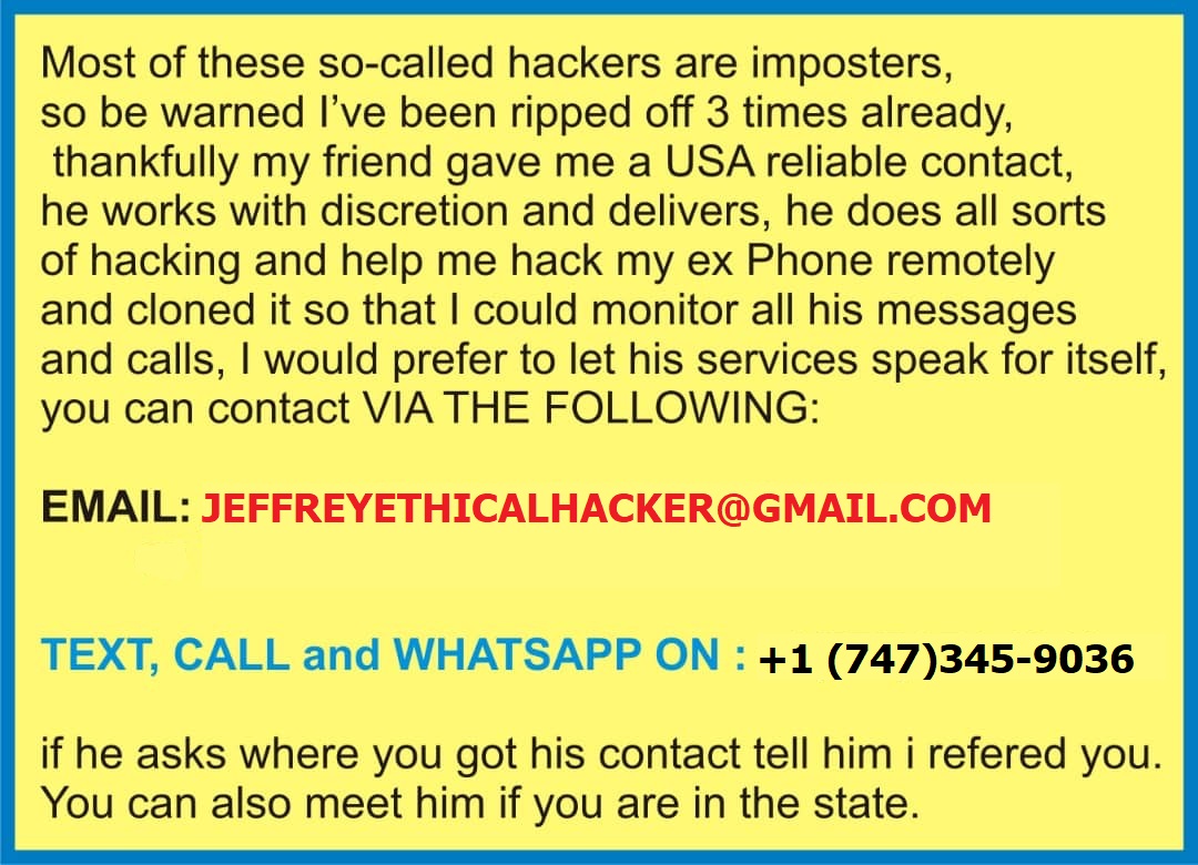 I know a real professional hacker who has worked for me once in this past month. He is very good at hacking. He offers legit services such as clearing of bad records online without it being traced back to you, he clones phones, hacks facebook ,instagram, whatsapp, emails, twitter, FIXES CREDIT REPORTS, tracks calls and messages. He also helps to retrieve accounts that have been taken by hackers. His charges are affordable, reliable, 100% safe. Contact him via gmail address.. fred cyberghost or contact him on fredvalcyberghost @gm ail. com and you can text,call and whatsapp him on +15177981808 and on +19782951763