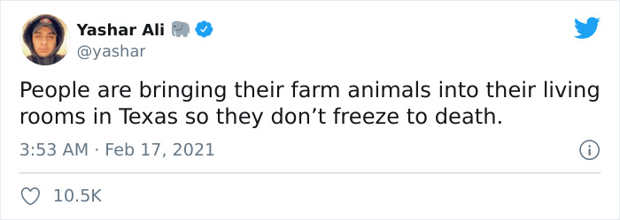 Texans, as well as Americans from other southern states, were encouraged to bring their farm animals inside during the cold snap. I know it’s a very difficult time, but the photos of the animals making themselves at home inside really do restore a part of your humanity.