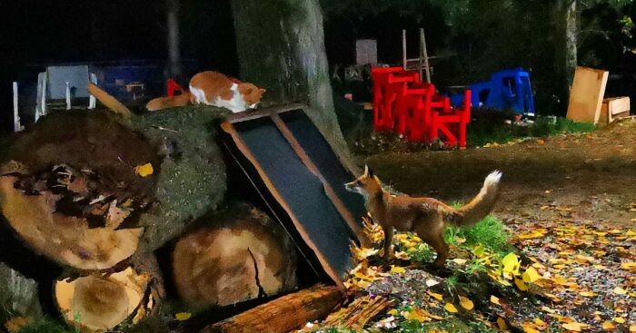 A few nights later, we were kinda shocked. We heared some noises and we found out that our beloved Cat and the Wild Fox were chasing each other in a pretty playful way…