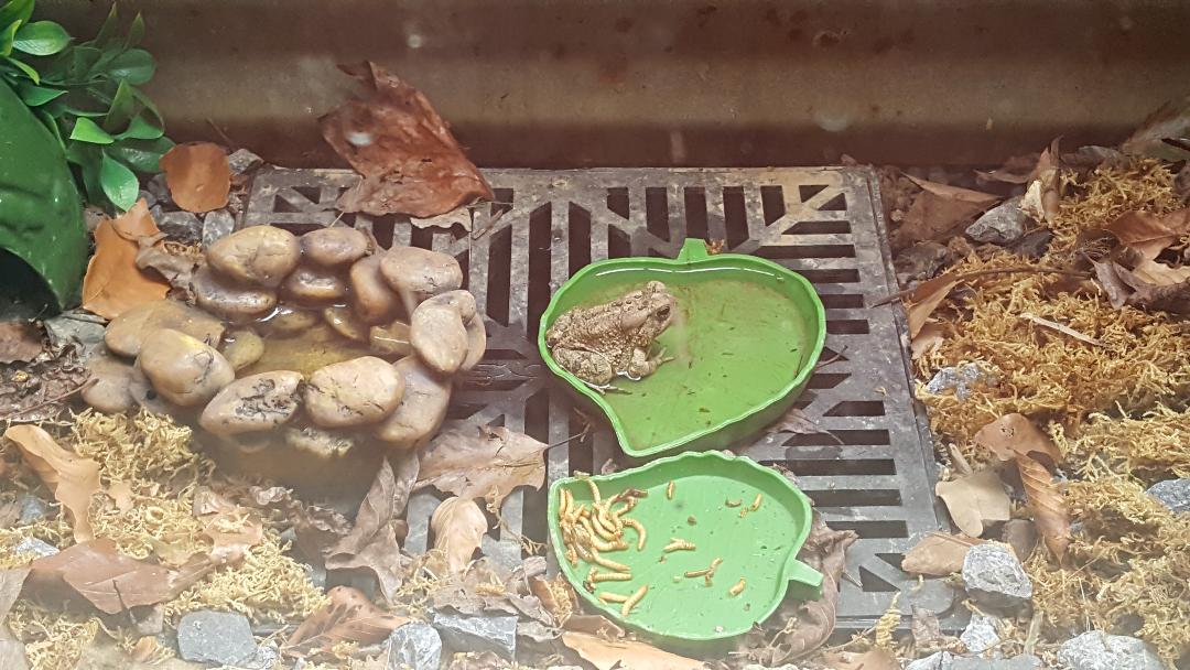 Here he is chilling in his habitat. :) He's not trapped in there BTW. He comes and goes through the drain as he pleases. Sometimes he brings friends. toadhouse-...6ed9cc.jpg