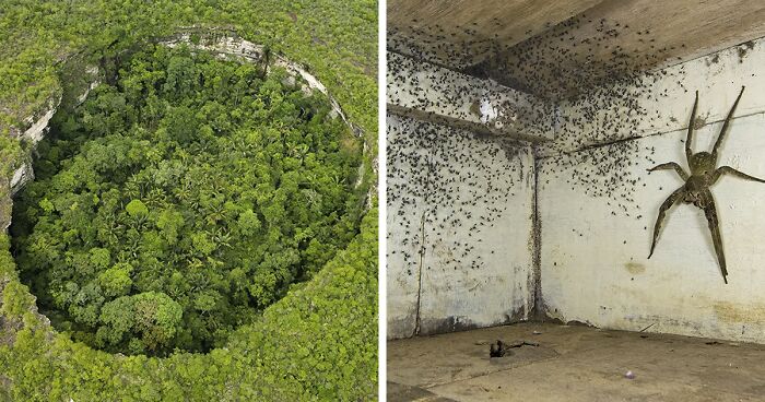 "After noticing tiny spiders all over his bedroom, Gil looked under his bed. There, guarding its brood, was one of the world’s most venomous spiders. Before safely relocating it outdoors, he photographed the human-hand-sized Brazilian wandering spider using forced perspective to make it appear even larger.