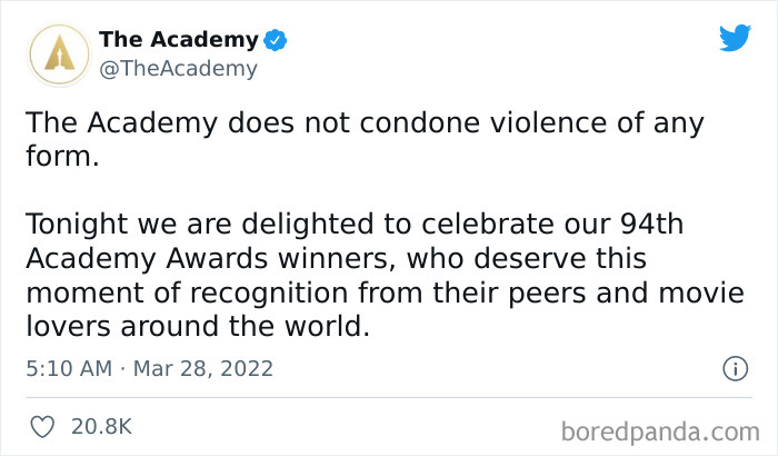 Yeah, my first reaction to "The Academy does not condone violence of any form" was "the shell you don't, you give awards for it". That, ofc, doesn't make either nasty jokes or hitting someone okay, but, like, look in a mirror folks.