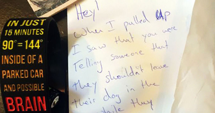 Two days ago a man named Andrew left this note on a windshield of a strangers car: “Hey, when I pulled up I saw that you were telling someone that they shouldn’t leave their dog in the car while they went to the post office. I think that is AWESOME! Just wanted to say thanks and here is a wristband and $5 to buy a beer on me”.