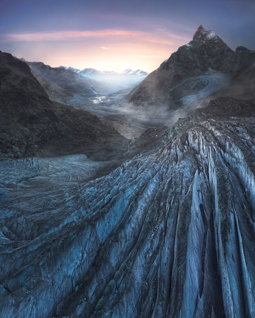 Glacier in the Alps of Switzerland taken by drone. On the upper left of the picture you can see the Matterhorn from a unique angle.