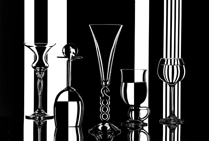 I intend to express the richness, depth and vastness of life through the black and white in still life. Several glass vessels with various shapes create a striking contrast under the refraction of the background light panel. The cups filled with water appear black and white reversed, while the cups without water outline the light edges. The upside-down one filled with water add a touch of mystery! Black and white complement each other, and the high contrast gives people a sense of heaviness.